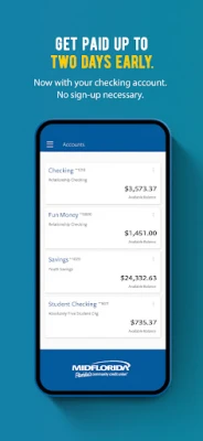 Set up direct deposit right in the app and get paid up to two days early with Free Early Paycheck. Plus, pay bills electronically and easily transfer money between your MIDFLORIDA accounts or to and from accounts you own elsewhere.