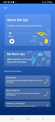 Warm Me Up! will create a unique warm up for you. It can generate a warm up based on how much time you have available or you can browse the individual tracks and create your own warm up as you desire. The exercises are recorded in high quality audio. A lush baby grand accompanies the singer through each exercise and a professional singer guides you through the first two repeats of each. On screen, each exercise is accompanied by suggestions and instructions to help you get the most out of each exercise.